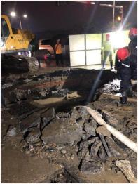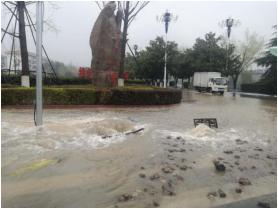 不到10分鐘,應(yīng)急搶修隊(duì)員迅速到達(dá)南湖廣場。現(xiàn)場發(fā)現(xiàn)有大量泥沙被水沖出,這說明漏水點(diǎn)附近地基可能已被水流淘空。為防止發(fā)生人員安全事故,搶修人員冒著大雨站在現(xiàn)場,提醒過往車輛和行人繞行。經(jīng)現(xiàn)場仔細(xì)勘查,搶修人員迅速制定維修方案,并投入到緊張的搶修工作。