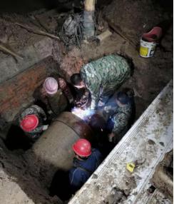 該段水泥管屬于主城區(qū)老舊管網(wǎng),管道周圍環(huán)境復(fù)雜,布有國(guó)防光纜、天然氣管道等重要設(shè)施,不能動(dòng)用大型機(jī)械,只能通過(guò)人工及簡(jiǎn)易工具開(kāi)挖。時(shí)間緊,任務(wù)重,為爭(zhēng)取搶修時(shí)間,搶修人員一邊現(xiàn)場(chǎng)制訂維修方案,一邊聯(lián)系準(zhǔn)備各種配件和維修材料。為將對(duì)用戶的影響降至最小范圍,水廠實(shí)行減壓供水,待開(kāi)挖和搶修材料一切準(zhǔn)備就緒后,搶修人員實(shí)行帶水作業(yè),先給套管預(yù)留一個(gè)DN50鋼管作為導(dǎo)流口,待水泥頭子徹底凝固后再關(guān)閉導(dǎo)流口。封堵水泥頭子時(shí),噴涌而出的水流濕透了搶修人員的衣服,速干水泥灼傷了他們的皮膚,但他們沒(méi)有一絲退縮,仍爭(zhēng)分奪秒地在水坑中忙碌著搶修工作。