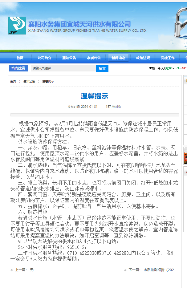 近日,我市出現(xiàn)強降雪天氣,極端低溫天氣易造成供水管網(wǎng)、水表、水龍頭等設(shè)施的凍損,影響市民用水安全。為保障全市供水安全穩(wěn)定,宜城天河供水公司堅持提前部署、預(yù)防為主、及時搶修原則,扎實做好寒潮及春節(jié)期間保障供水的防御和應(yīng)對措施準(zhǔn)備。
